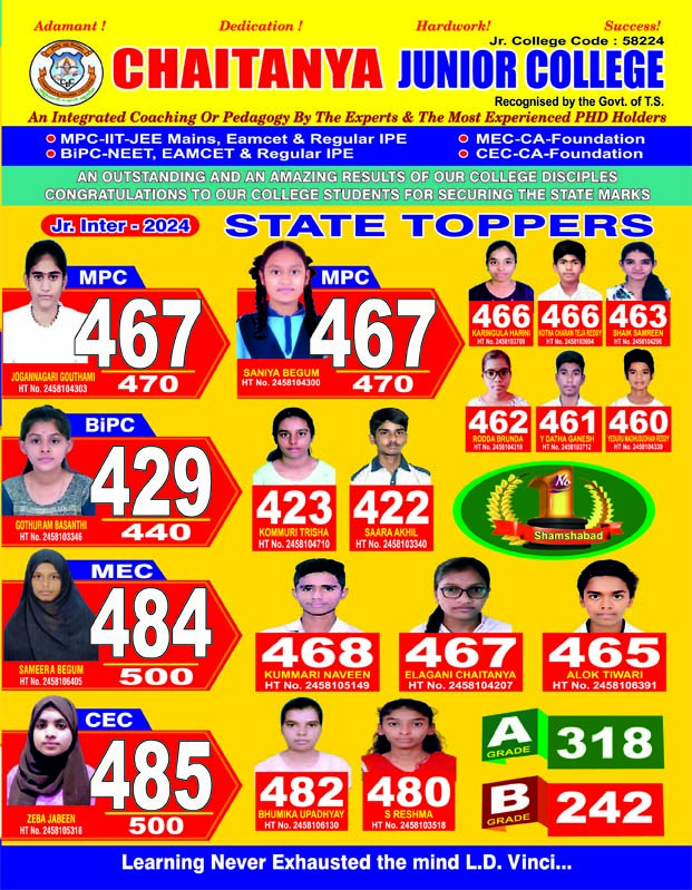 Join us at Chaitanya Junior College, Shamshabad, where excellence meets opportunity! Enroll your child today to embark on a journey of academic growth, personal development, and future success. Secure their pathway to excellence now!